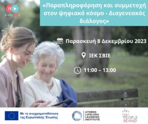 ΠΑΡΑΠΛΗΡΟΦΟΡΗΣΗ ΚΑΙ ΣΥΜΜΕΤΟΧΗ ΣΤΟΝ ΨΗΦΙΑΚΟ ΚΟΣΜΟ - Διάλογος μεταξύ Γενεών. Συμμετοχή τώρα Ημερομηνία: Τοποθεσία: Παρασκευή 8 Δεκεμβρίου 2023: ΙΕΚ SBIE (Κάνιγγος