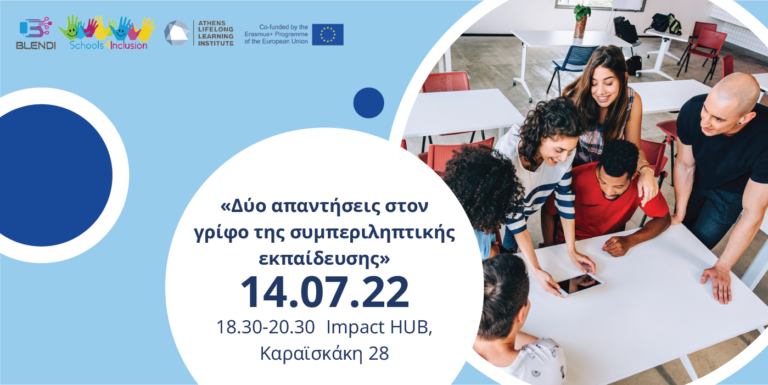 Το Athens Lifelong Learning Institute διοργανώνει εκδήλωση παρουσίασης των δράσεων και αποτελεσμάτων των έργων “Blended Learning for Inclusion- BLENDI” and “Schools4Inclusion”. Κοινός στόχος των έργων είναι η δημιουργία και εφαρμογή λύσεων για μία συμπεριληπτική εκπαίδευση που θα αγκαλιάζει και θα υποστηρίζει όλους τους μαθητές και τις μαθήτριες της Πρωτοβάθμιας και Δευτεροβάθμιας Εκπαίδευσης.